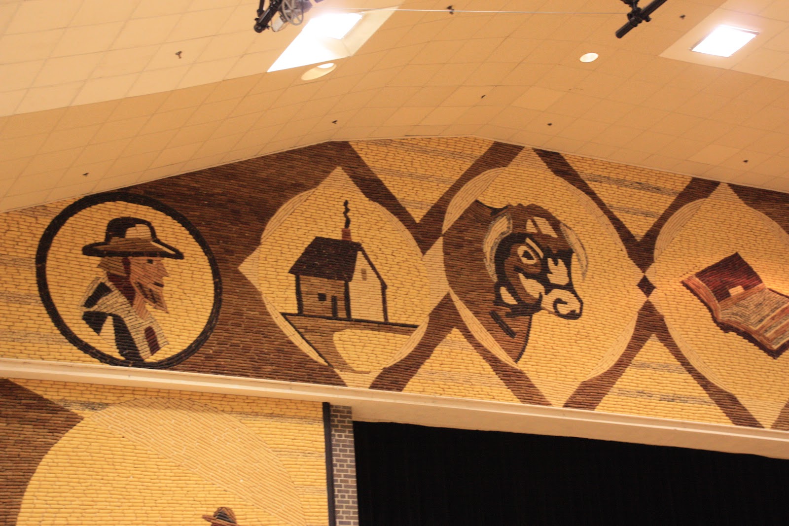 After arriving in Mitchel our first order of business was the often talked about Corn Palace. It is a mere 10 minutes from our campground. Upon further investigation of said Palace, Tony and I, and the girls have no idea what the big attraction is. Yes, it has some interesting art and history being built in 1892, but other than that, it's a big gift shop. We even had an ear of corn each at the concession stand which was not very good and it was served with soy butter that was flavorless. I'm guessing this is one of those trips that will be just checked off our must see list and that is that. Below are some pictures of the interesting art outside and inside made entirely of ears of corn.